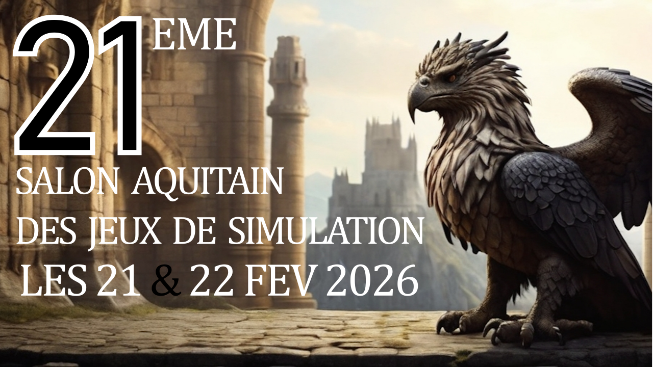 La 21ème Convention de l'ASCPA les Griffons, le SALON AQUITAIN DES JEUX DE SIMULATION, aura lieu les 21 et 22 Février 2026 à la Salle Bellegrave, Avenue du Colonel Robert Jacqui à PESSAC (33).